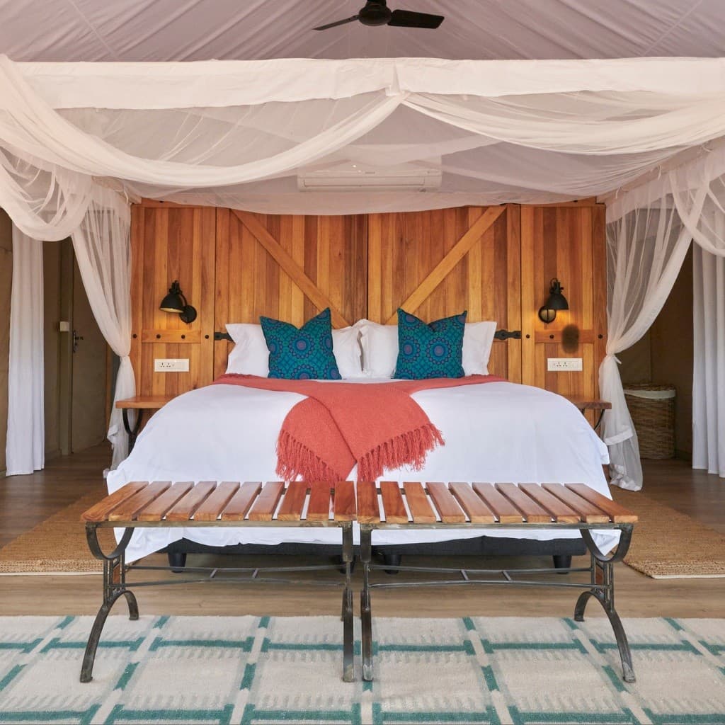 3 nights at The Wallow Lodge. Located within a Private Game Reserve, this beautiful tented camp offers a very peaceful stay. Sixteen suites are thoughtfully positioned to capture the best views of the Masuwe River and the surrounding wilderness. The creative use of canvas evokes a classic safari atmosphere, enhanced with all modern comforts. Each suite is raised beneath the shade of ancient riverine trees; from this elevated position, guests can enjoy uninterrupted river views from their private balcony. The décor and attention to detail create a perfect balance between contemporary style and homely touches, without detracting from the surrounding wilderness.